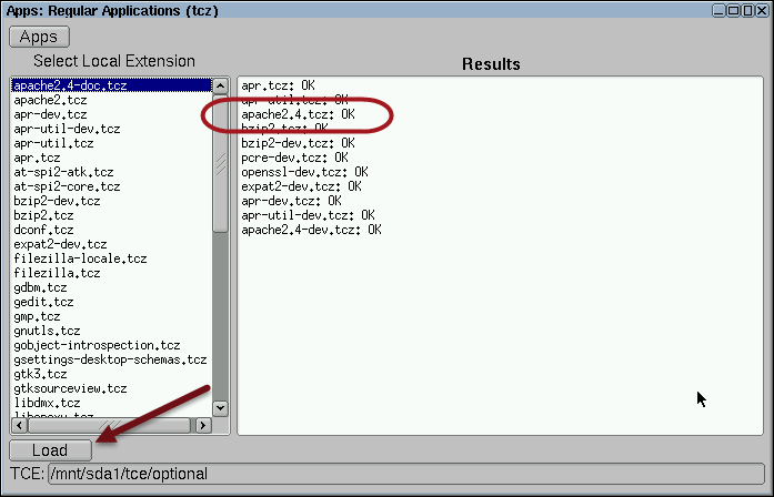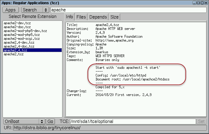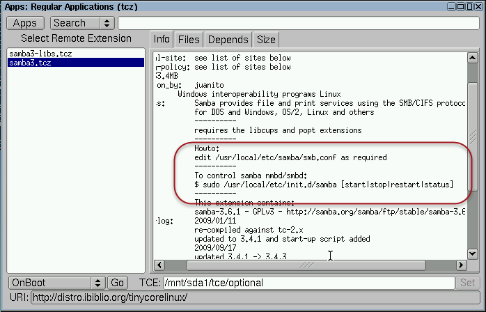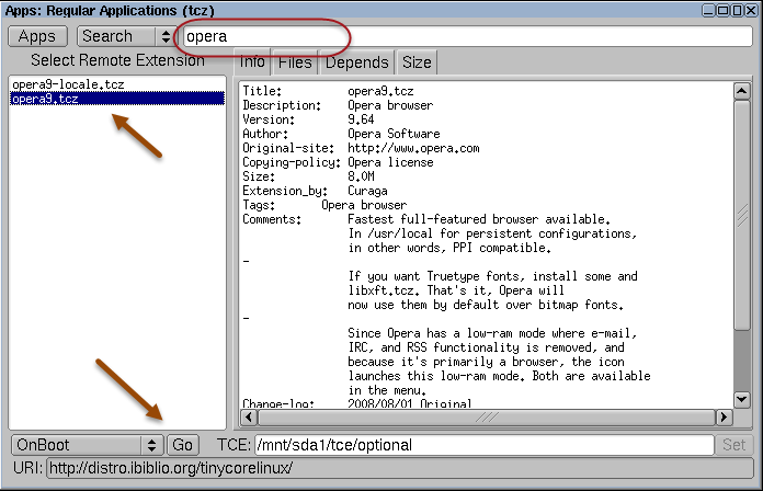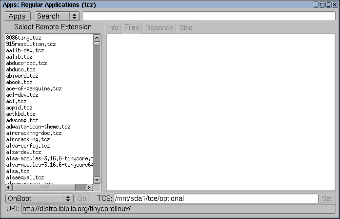 •.appbrowser → Contiene la ruta del directorio donde se almacenan las aplicaciones (extensiones) que se instalan. El directorio predeterminado es /mnt/sda1/tce/optional. Similar a (Archivos de programas de Windows)