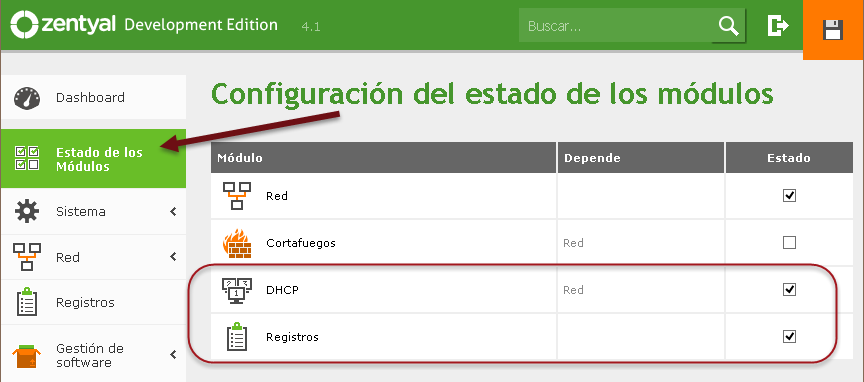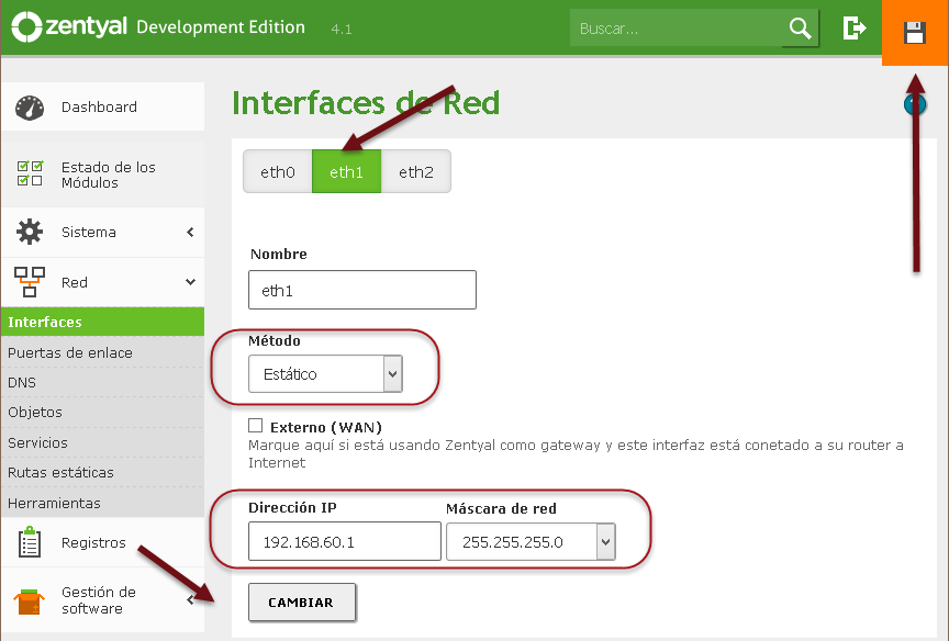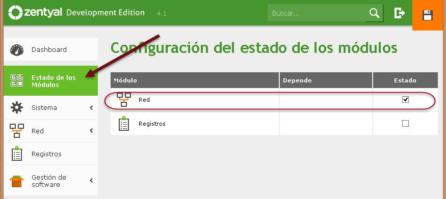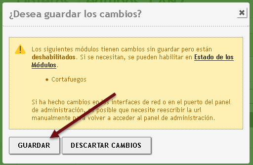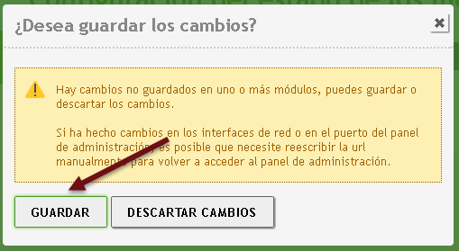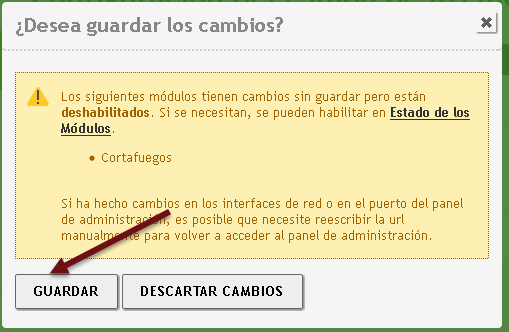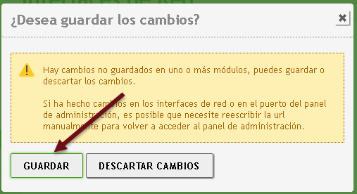 Al final el módulo de red debe estar activado y el icono de guardar sin fondo naranja.