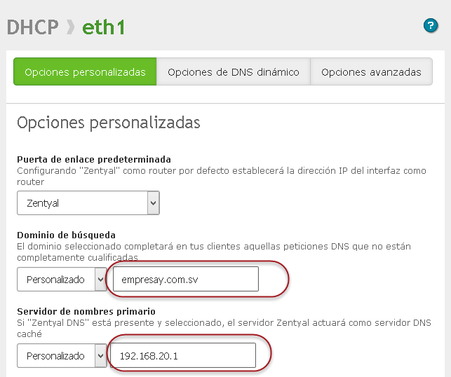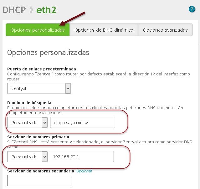•Definir servidor de Nombres primario: Pueda que el Zentyal detecte el DNS del ISP, si se tuviera un servidor DNS de la empresa, se deberá escribir la dirección IPv4 del servidor DNS