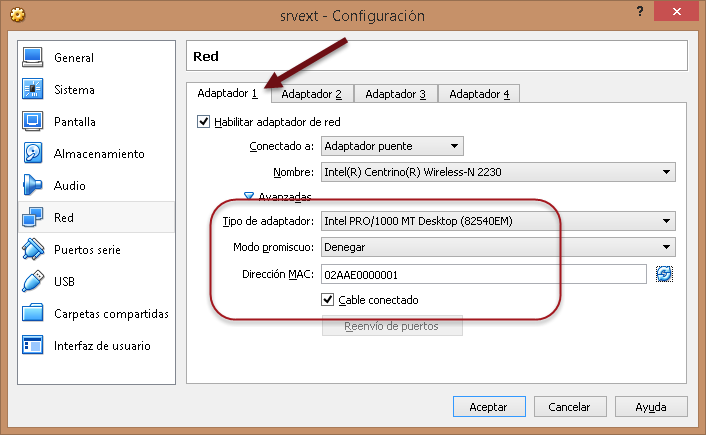 Red / Adaptador2: Esta será la interfaz eth1 y tendrá conexión a la LAN1.