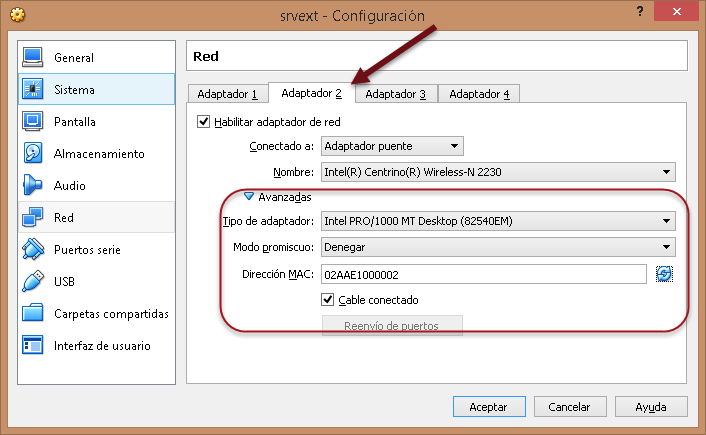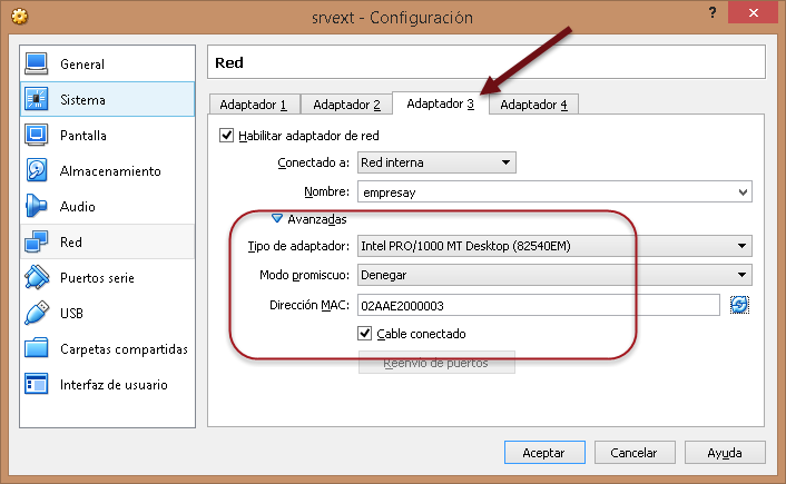 Red / Adaptador3: Esta será la interfaz eth2 y tendrá conexión a la LAN2.